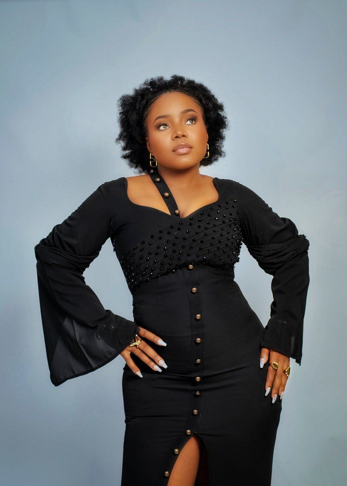 The Angela dress is stylish figure-mugging dress featuring a front slant slit. It has an elastic strap with decorative buttons running down the front and chiffon pleats sleeve for added elegance. The bodice and sleeves showcases chiffon pleats and crystal hand beading same with the sleeves.