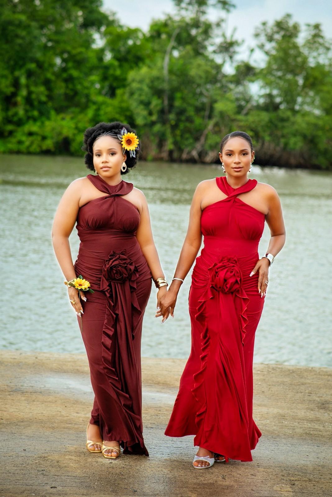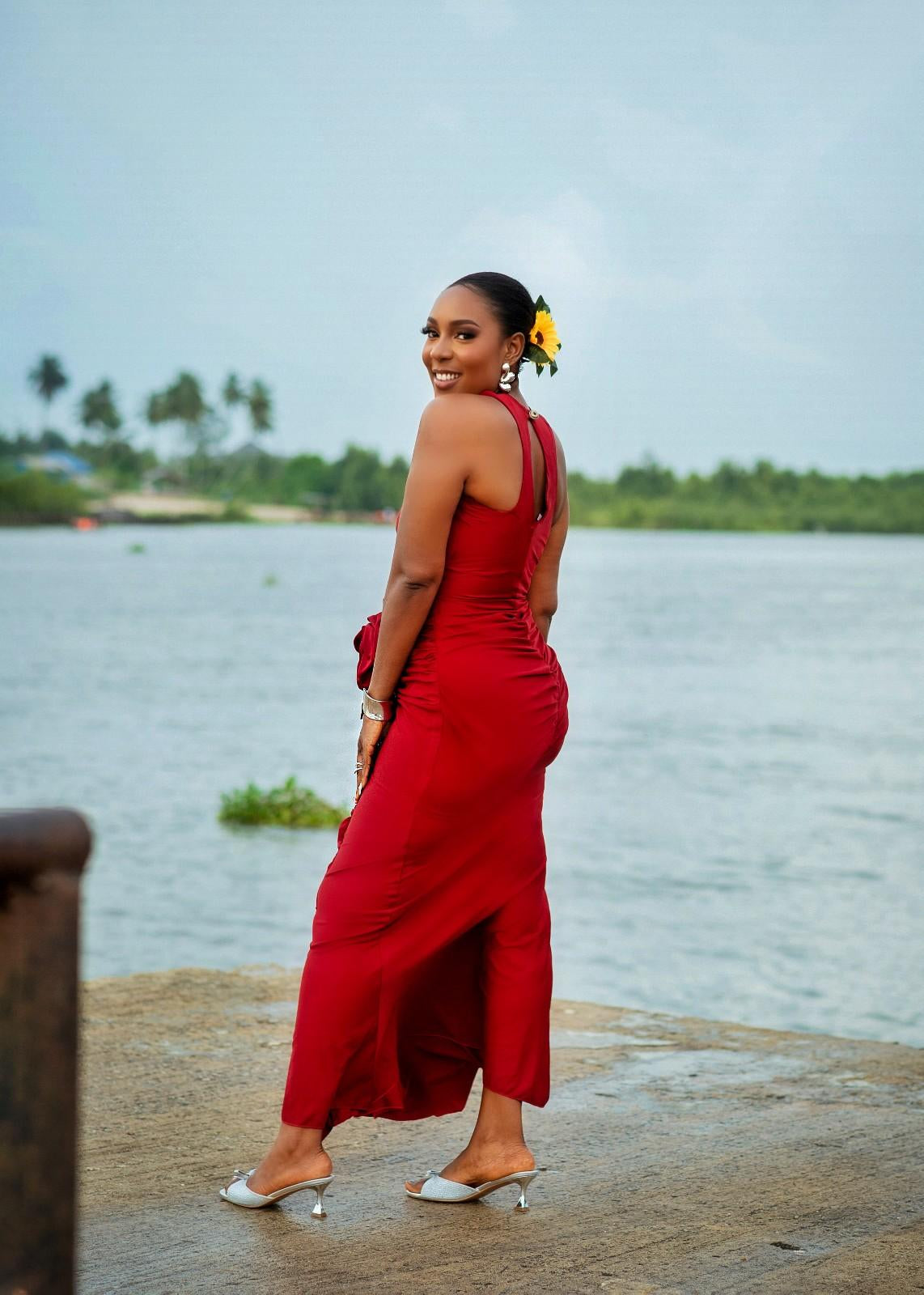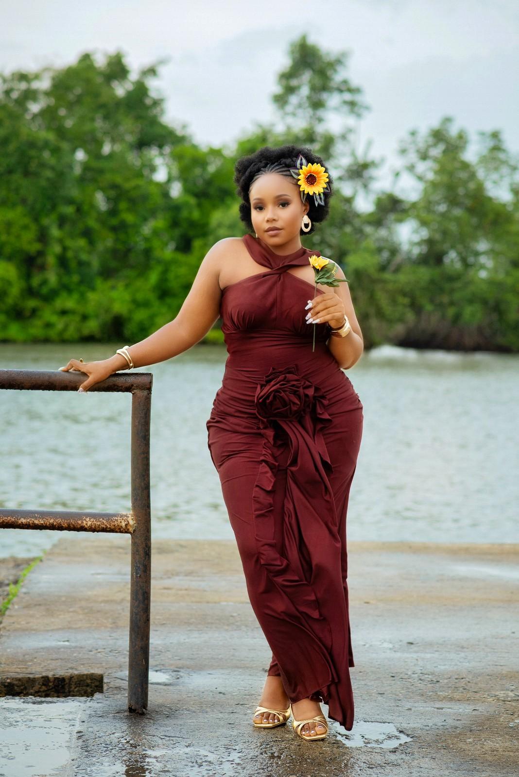 The Bianca dress is an elegant long gown it features a twisted halter neckline, a back button closure, and a ruched skirt design on both the front and back. A flounce detail and a delicate rose accent in the front adding a touch of romance and sophistication.