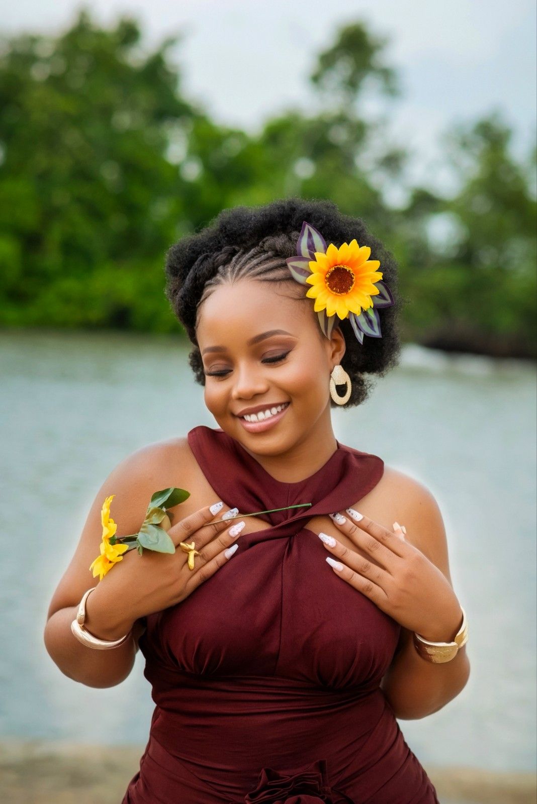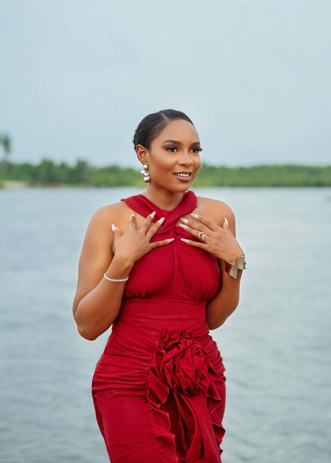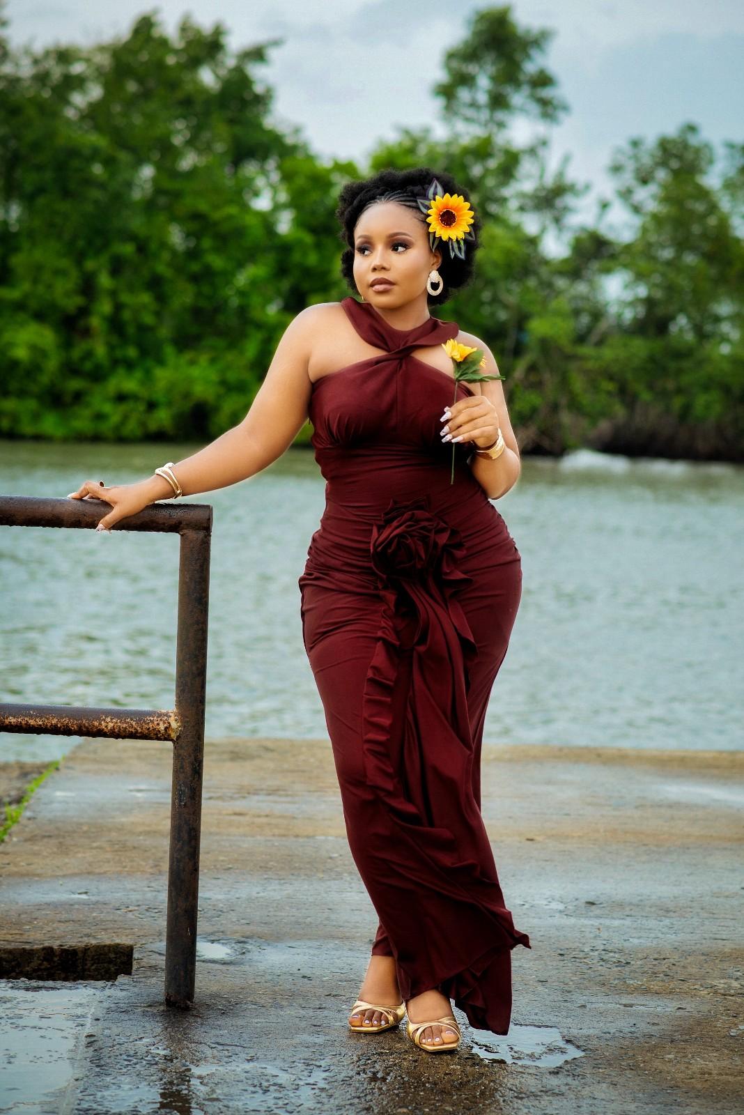 The Bianca dress is an elegant long gown it features a twisted halter neckline, a back button closure, and a ruched skirt design on both the front and back. A flounce detail and a delicate rose accent in the front adding a touch of romance and sophistication.