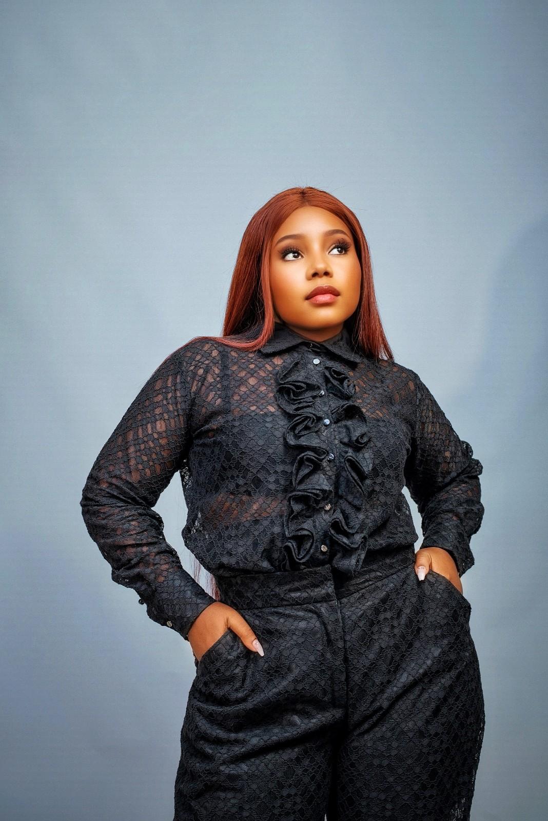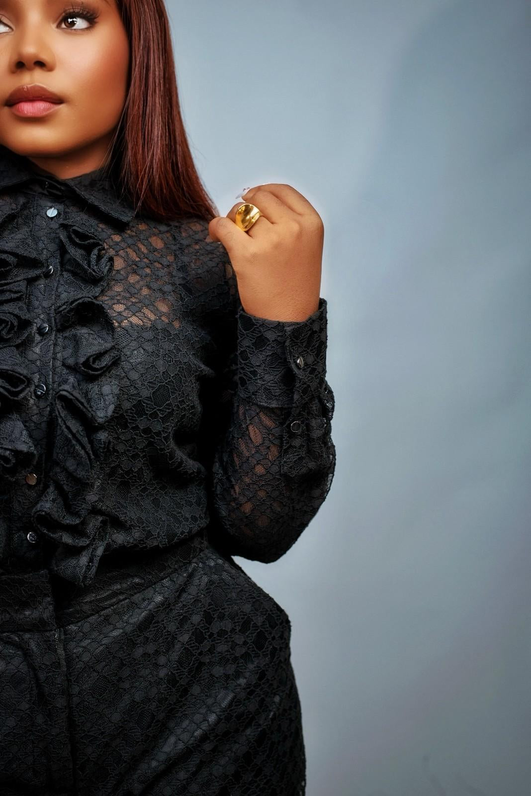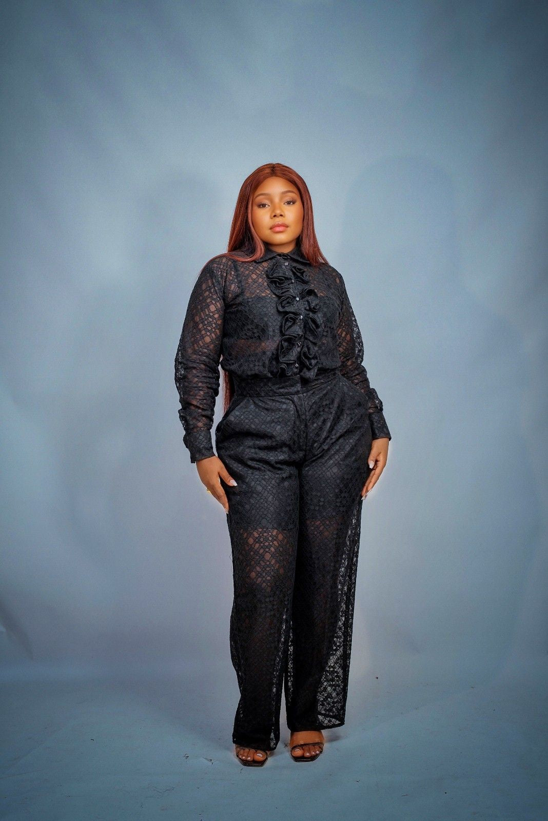 The Ciara set is a bold, sleek outfit made from black net fabric, consisting of a button down shirt and butt-cut trousers. The shirt features a flounce design. Along with button flap, adding a soft touch to its structured look. It has a long sleeves with cuffs and buttons. The trousers has a zipper fly, waist band and pockets for a comfortable.