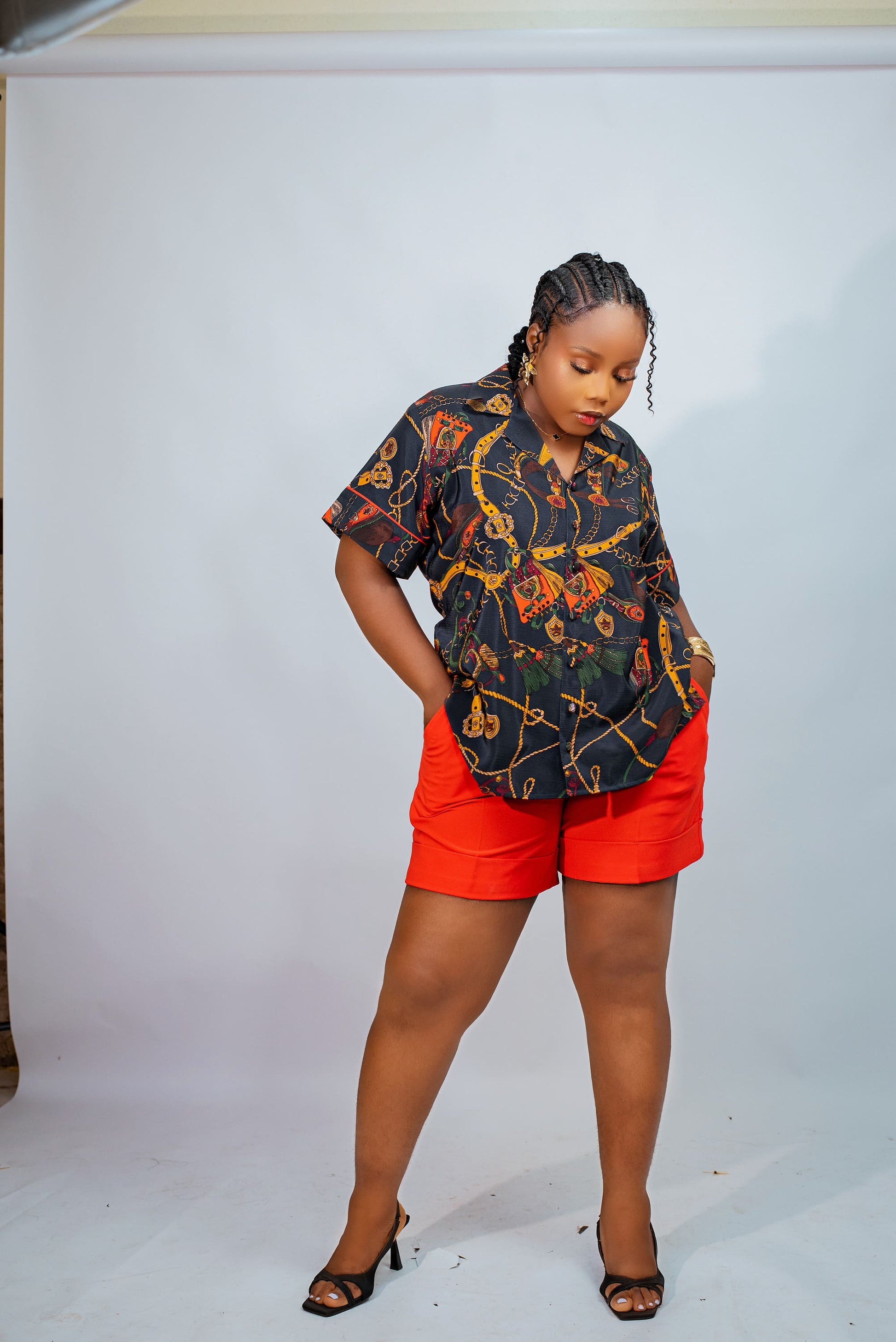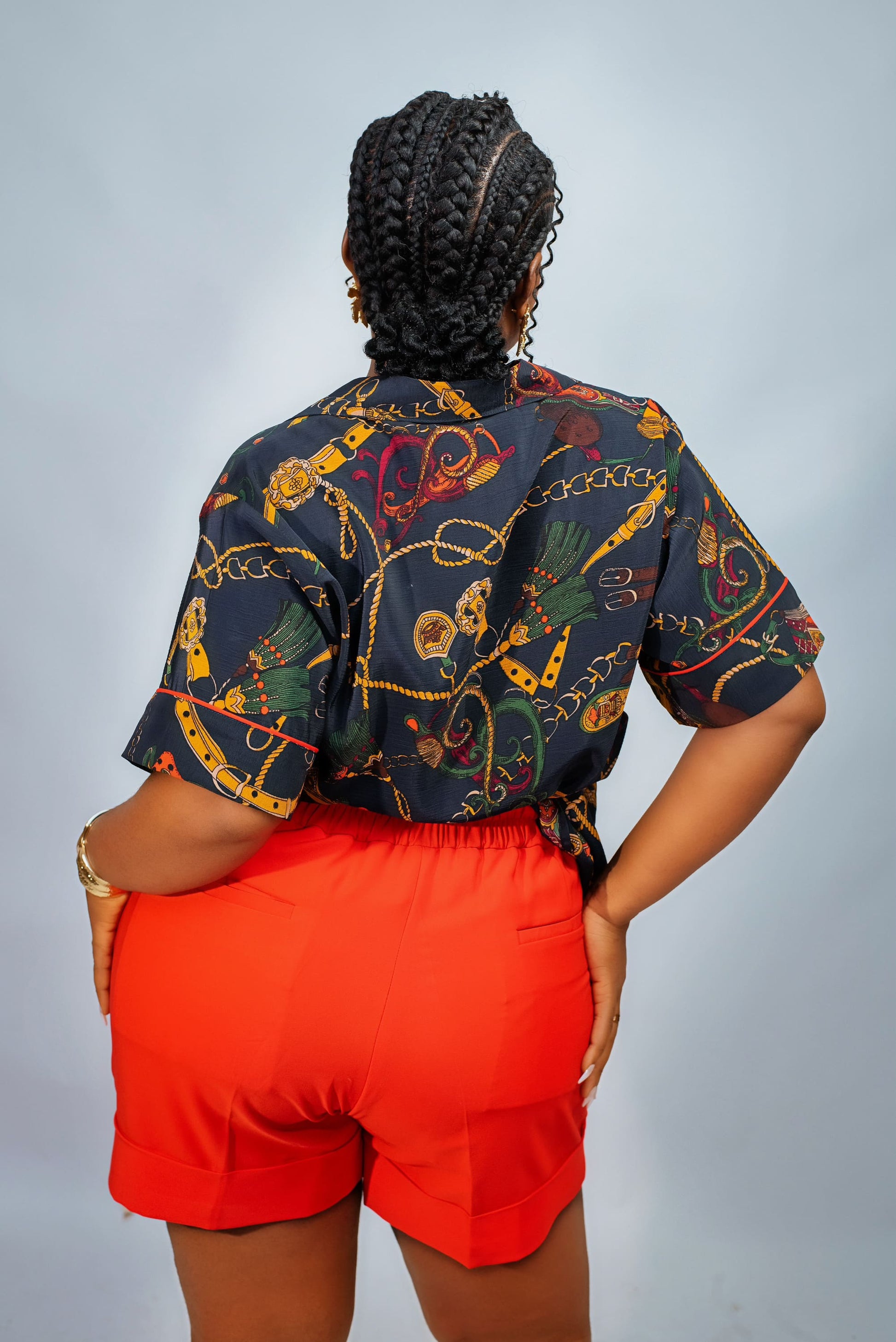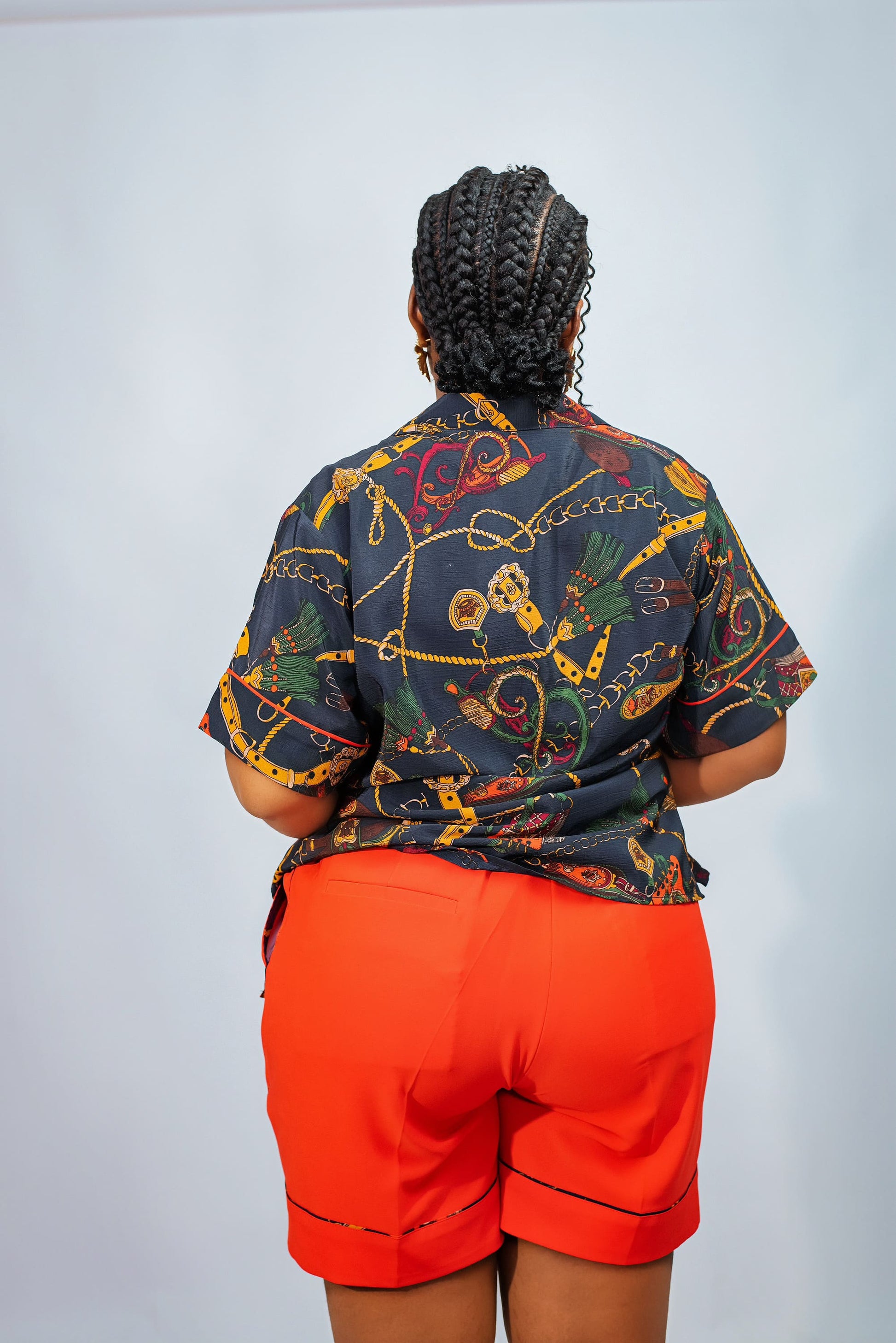 The eva set includes a dark navy blue abstract print shirt made of light crepe and matching orange thick crepe for the Shirt. The Shirt has a notched collar, button-down front, and Shirt sleeves with turn-up, with orange piping. The Shirts feature a turn-up hem, a back elastic band for comfort, a front zipper fly, a side pocket and a single welt pocket at the back for a trendy look.