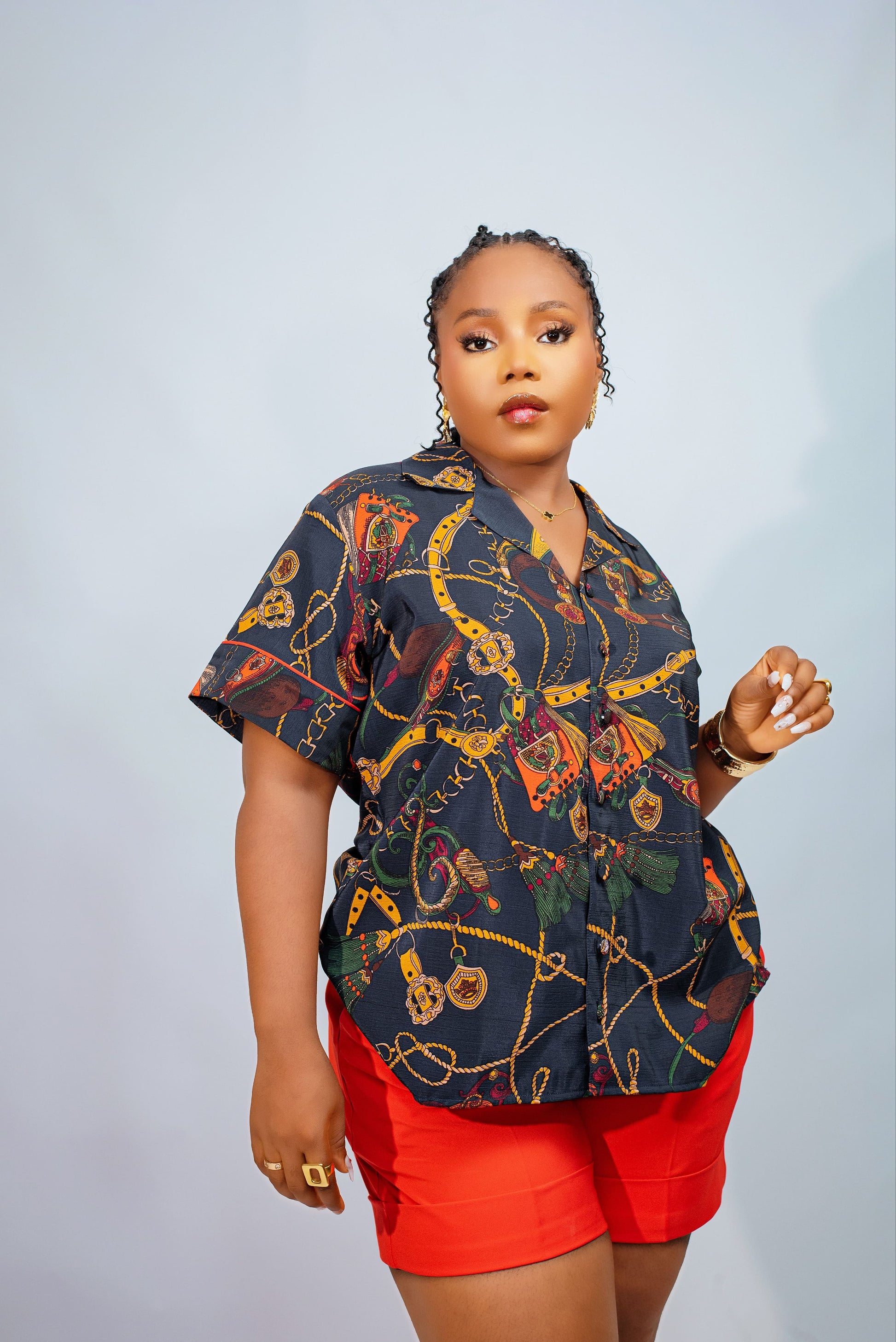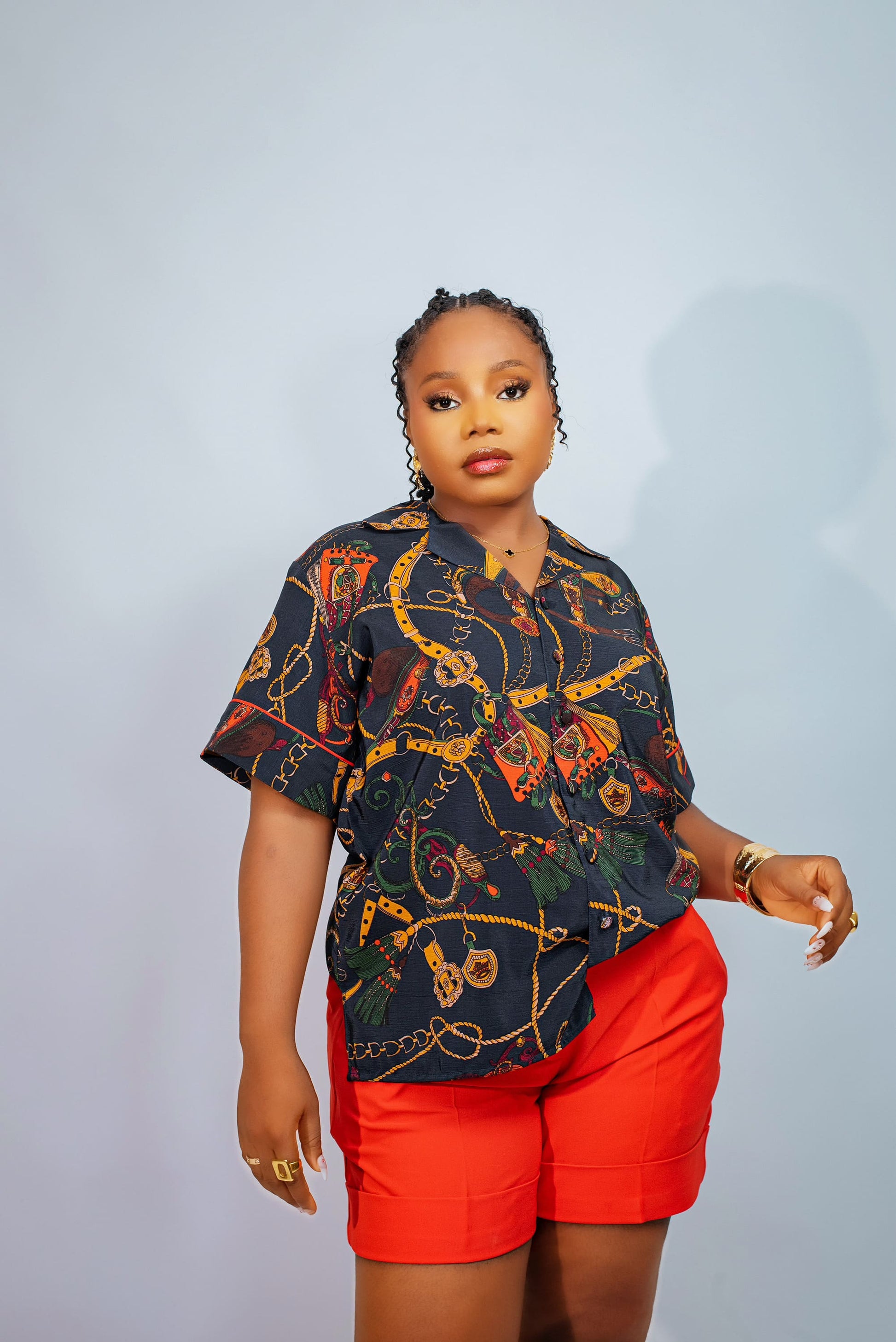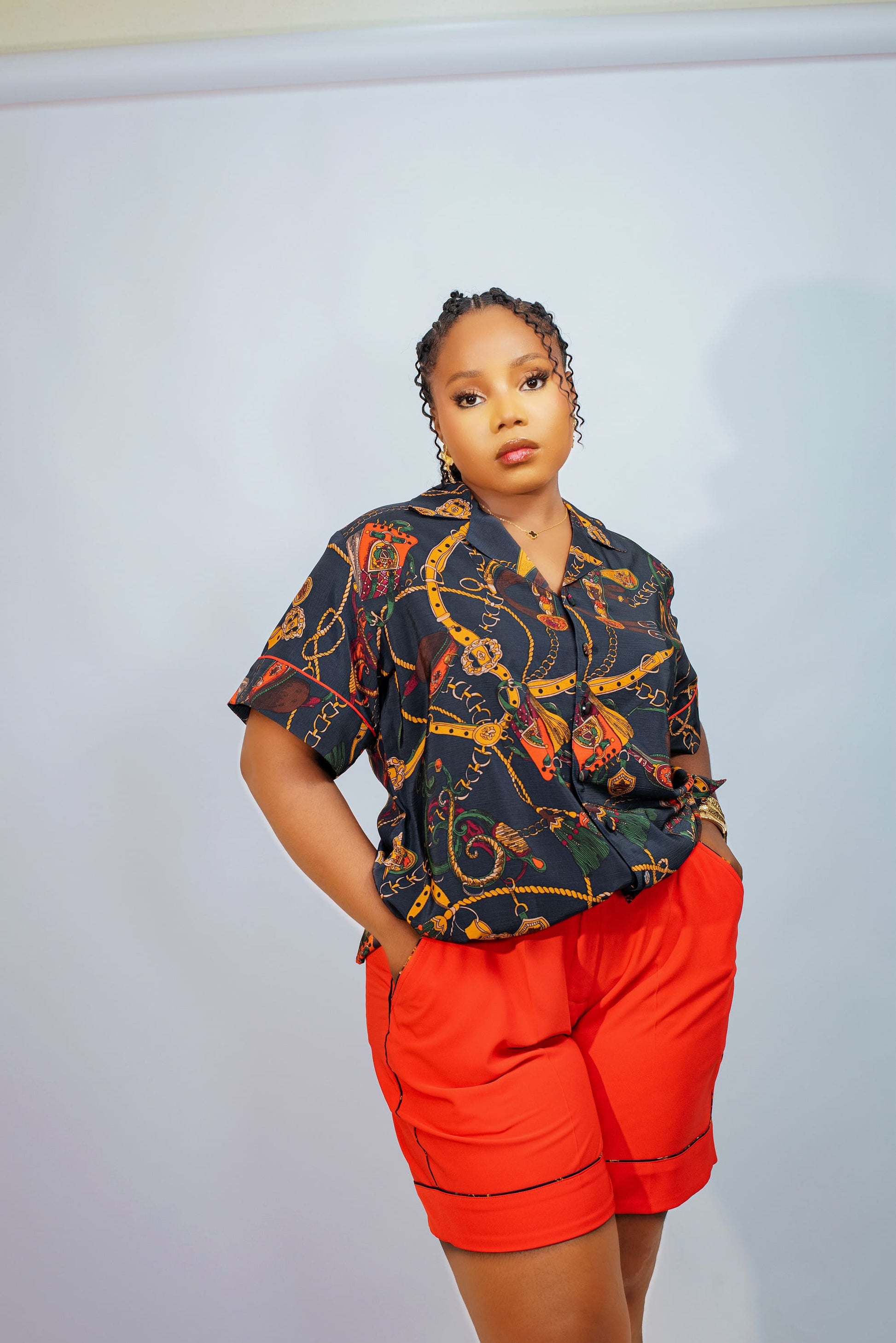 The eva set includes a dark navy blue abstract print shirt made of light crepe and matching orange thick crepe for the Shirt. The Shirt has a notched collar, button-down front, and Shirt sleeves with turn-up, with orange piping. The Shirts feature a turn-up hem, a back elastic band for comfort, a front zipper fly, a side pocket and a single welt pocket at the back for a trendy look.
