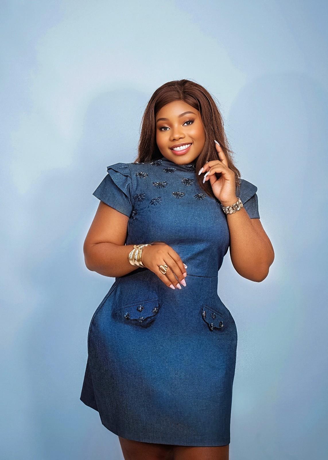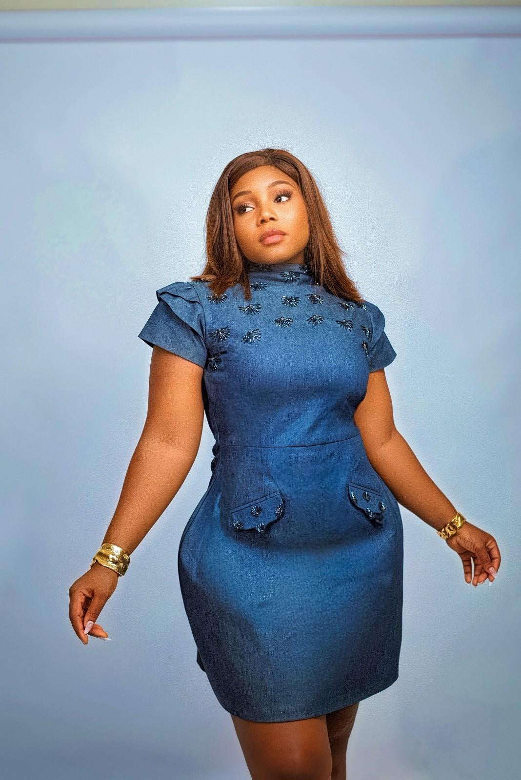 The Gaia dress is a beautiful straight gown made from denim blue fabric. It features a high neckline and a unique double sleeve design, with a tulip sleeve on top.