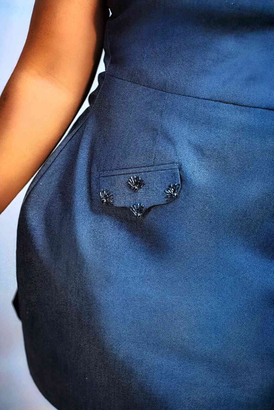 The gown includes a double front welt pocket with a flaps, both of which are adorned with beautiful hand beading also with the bodice of the gown.