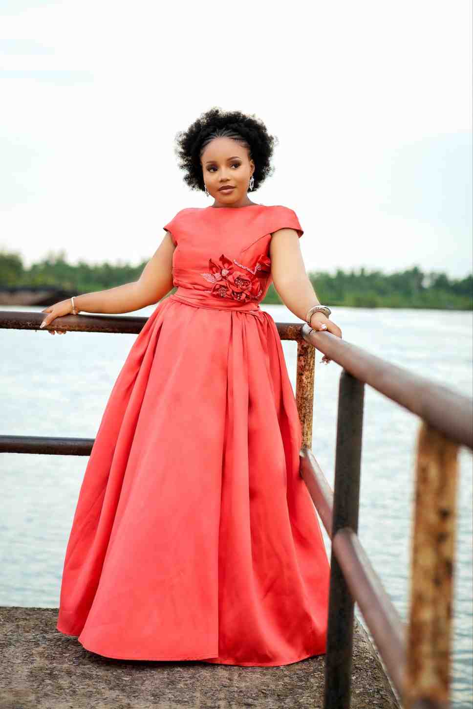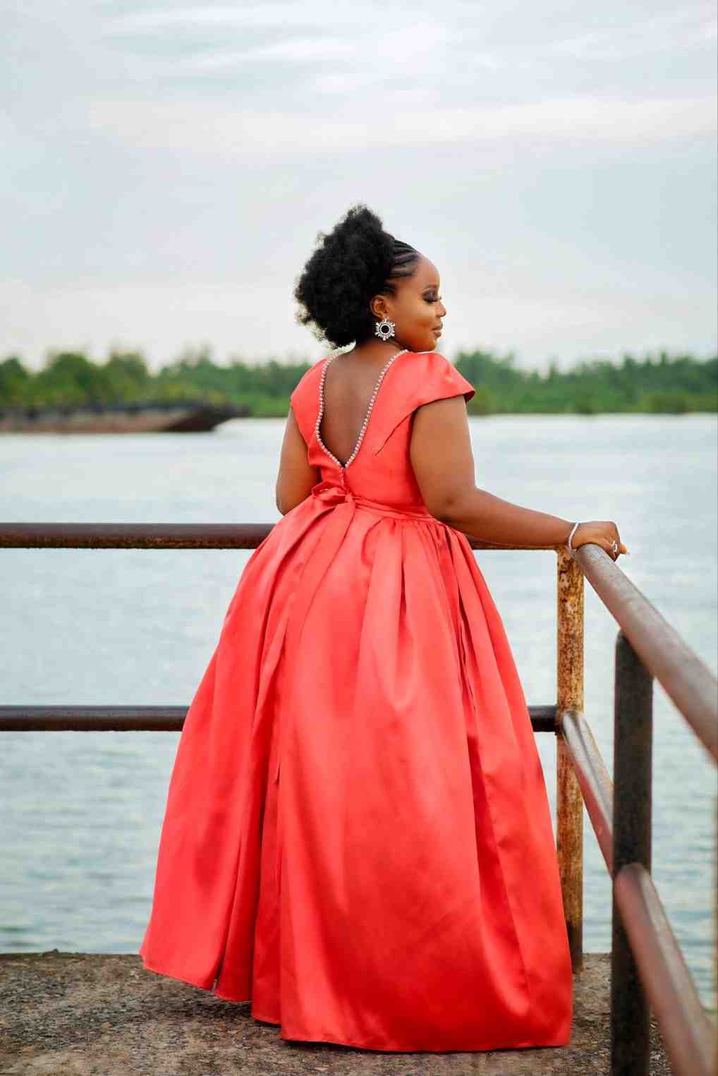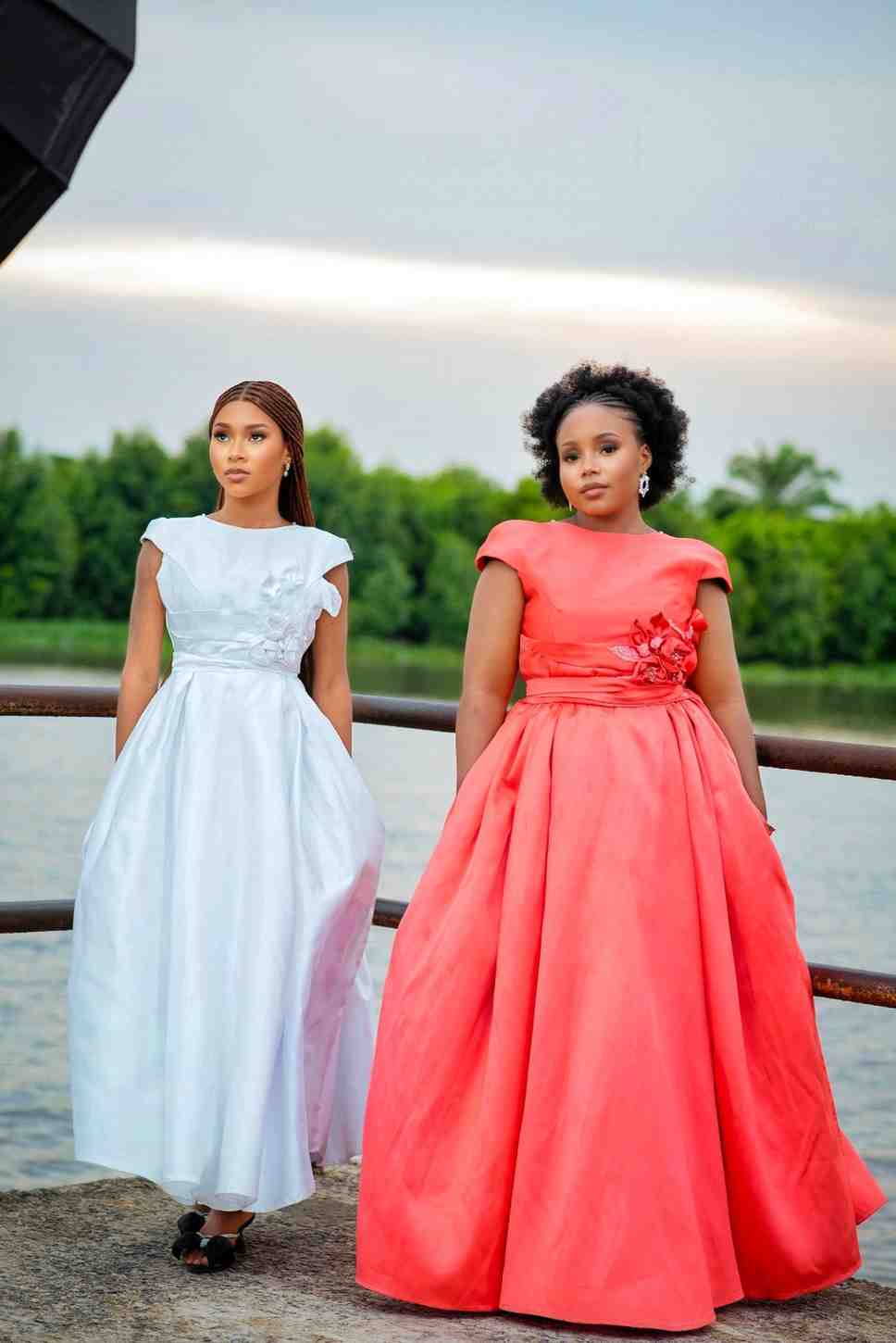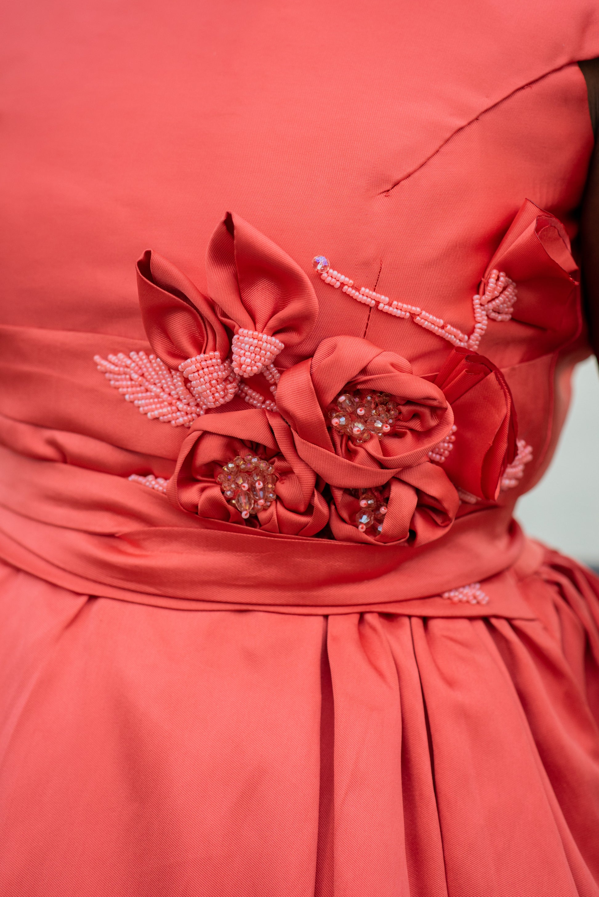 The rose dress is an elegant Mikado silk gown it features a gathered flare skirt, a dart designed bodice and subtle extended sleeves. The pleated niched waistline as adnored with handcrafted rose embellishment, intricately beaded for a refined touch. The dress is finished with a black tie rope and zip closure for secure fit.