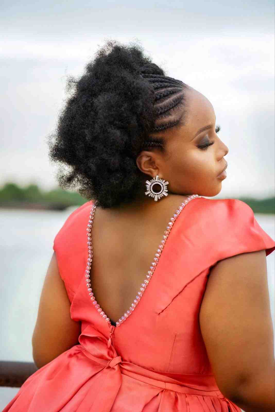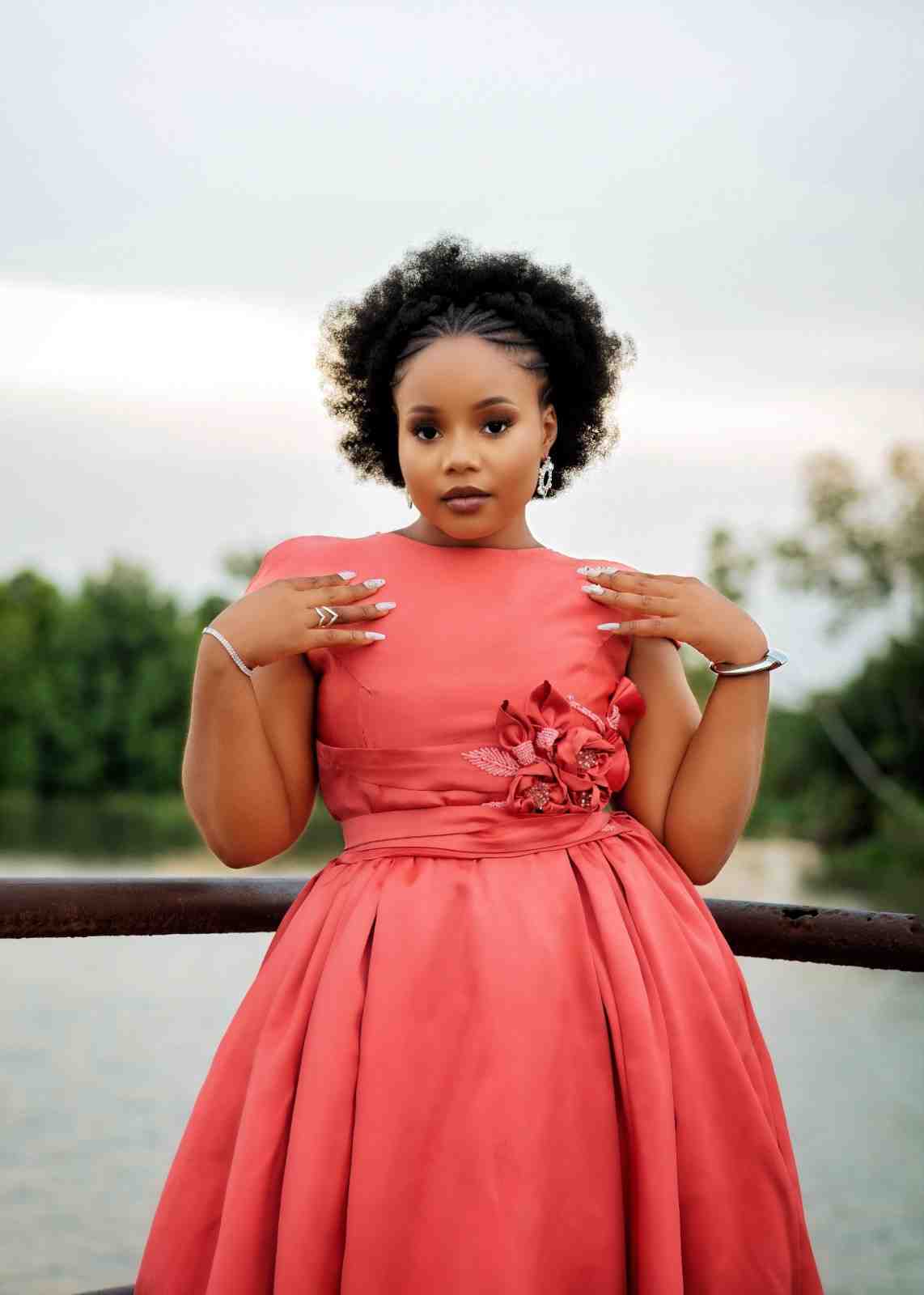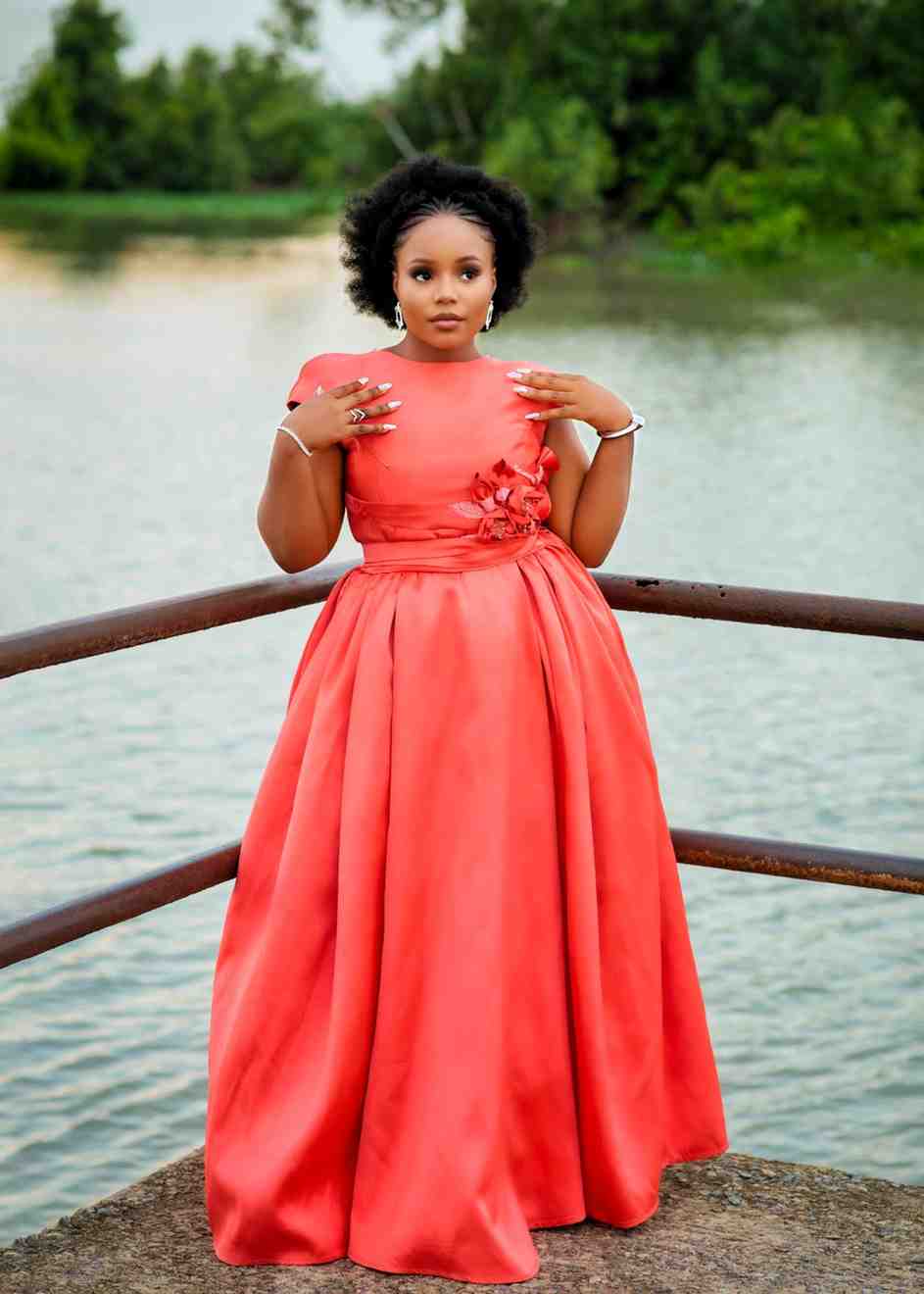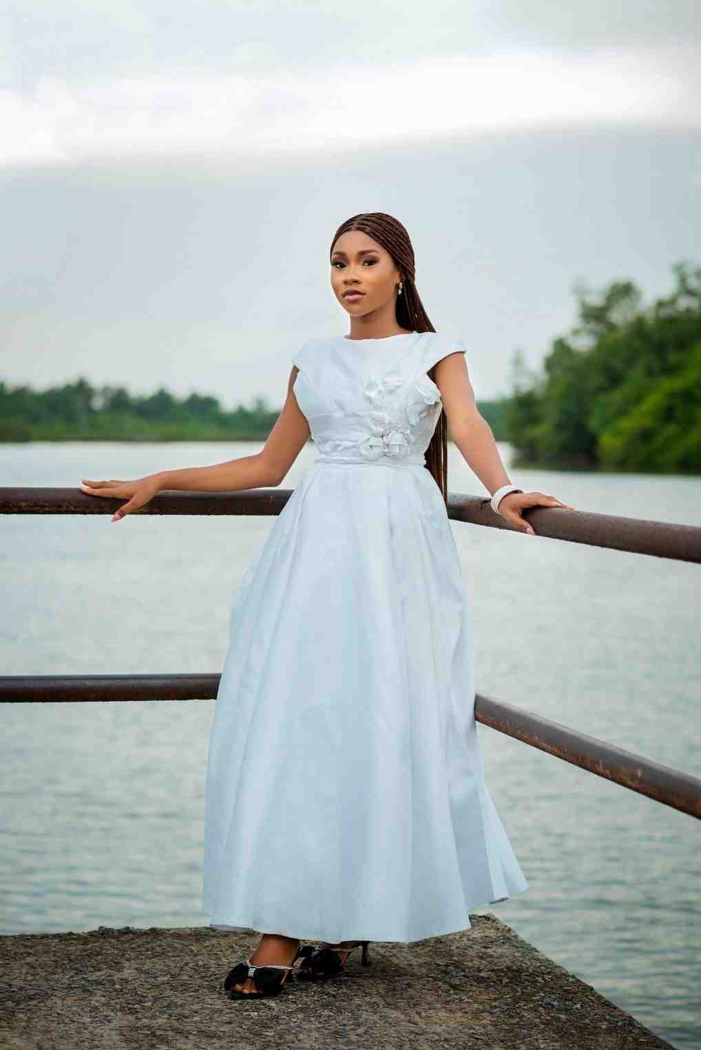 The rose dress is an elegant Mikado silk gown it features a gathered flare skirt, a dart designed bodice and subtle extended sleeves. The pleated niched waistline as adnored with handcrafted rose embellishment, intricately beaded for a refined touch. The dress is finished with a black tie rope and zip closure for secure fit.