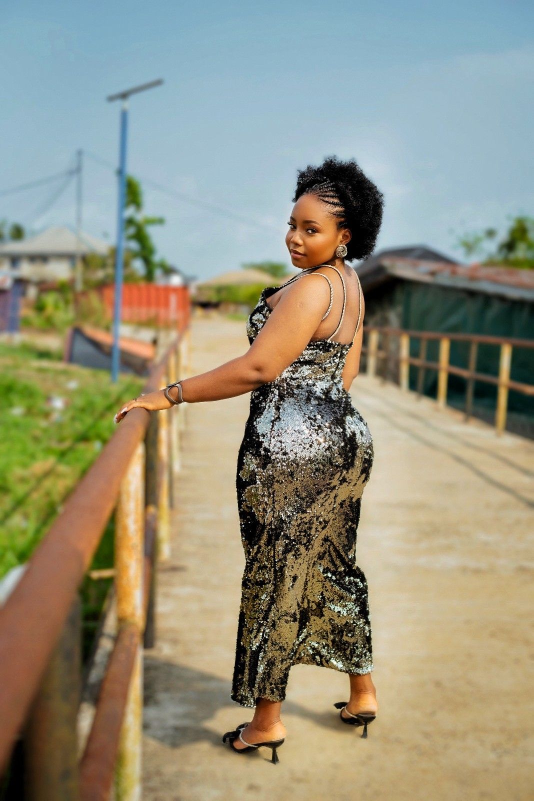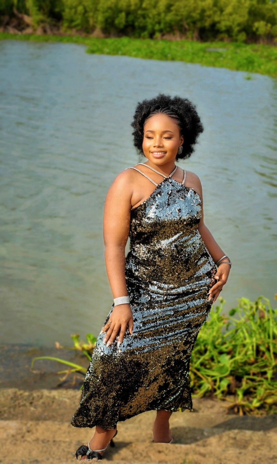 The Seraphina dress is an alluring black sequin body con gown that masterfully combine elegance with bold glamorous design the Seraphina dress features a subtle mermaid flare at the bottom, double thinning straps embellished with hand-sewn silver cup chains, halter neckline with a diamond-pointed shape. The lower back adds a touch of elegance, while a concealed zip ensures a smooth, comfortable fit. ensures a smooth, comfortable fit. Fully lined