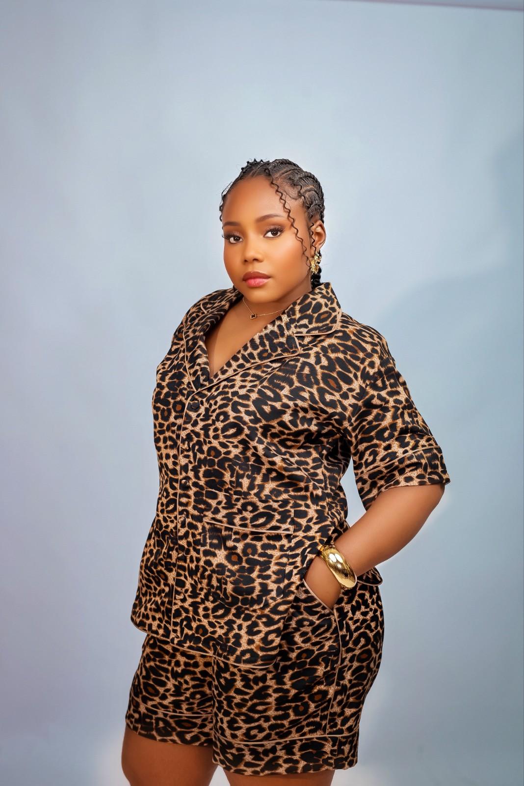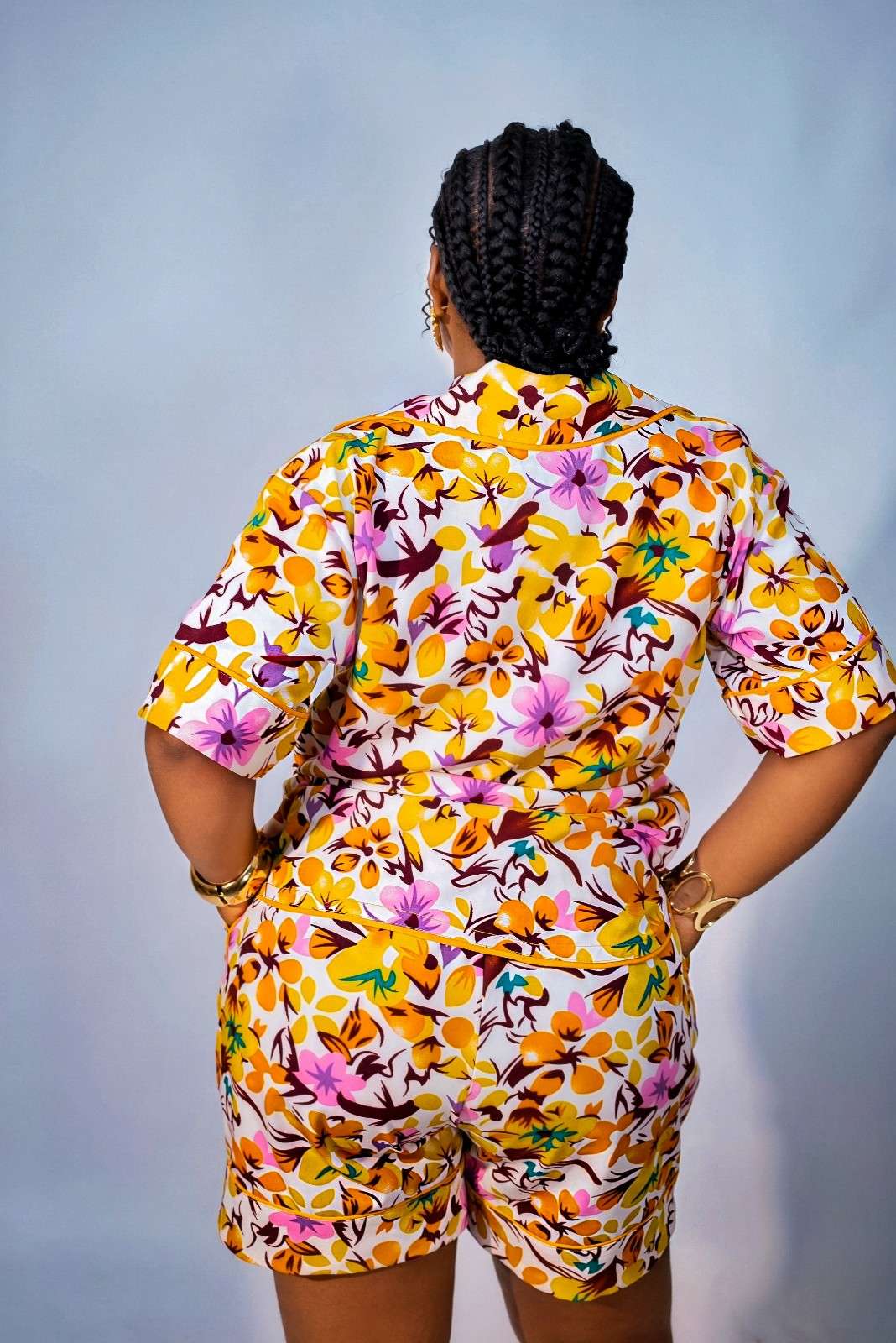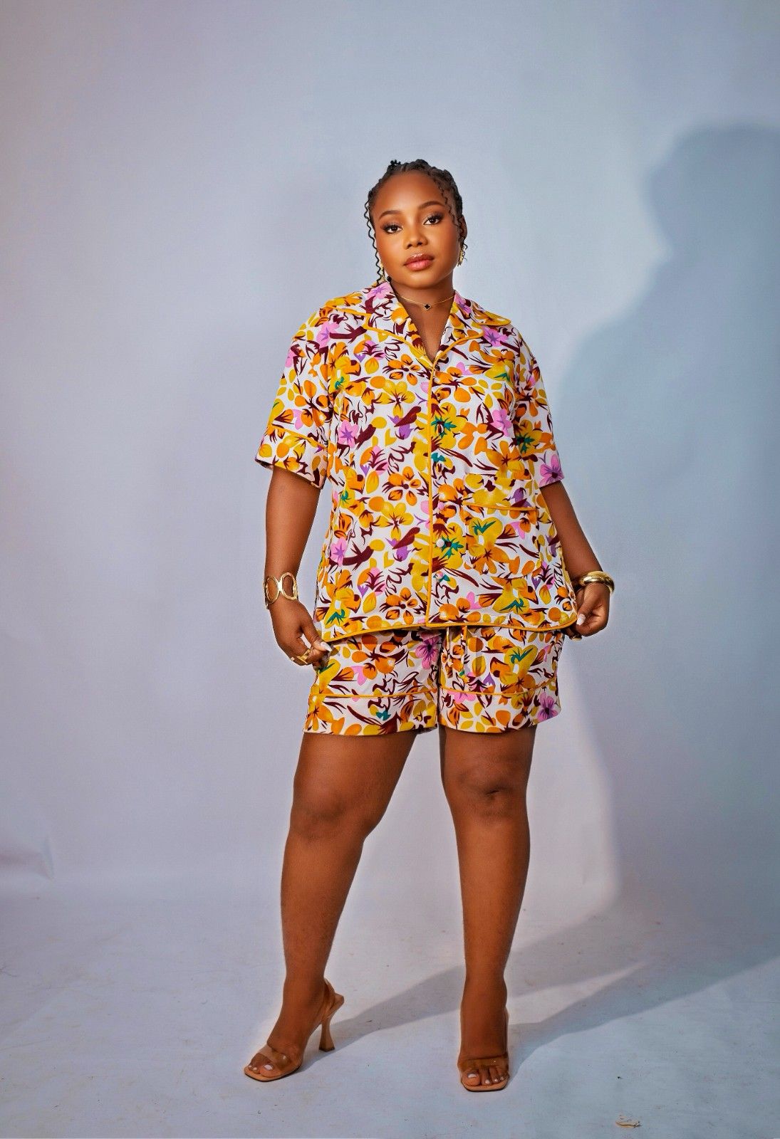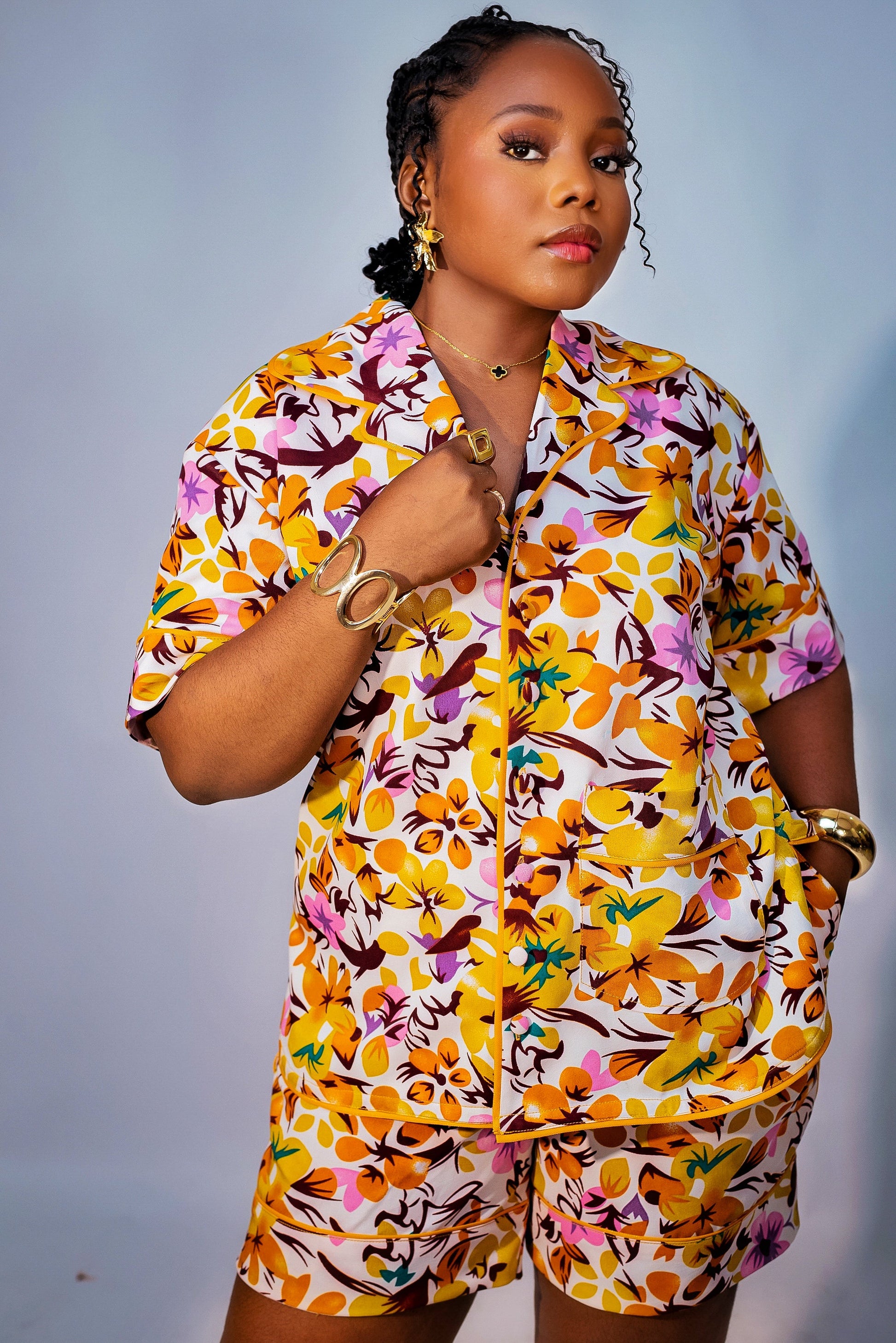 Tamsin set is a stylish ensemble crafted from thick fabric featuring an animal skin print and a mustard yellow floral print. This set includes a shirt and matching Short. The shirt has a notched collar, button-down front with fabric -matched buttons and a front pocket with a turn-up design. It also has Shirt sleeve accented with fabric piping, an elastic waistband with a rope for easy flattening and a convenient side pocket.