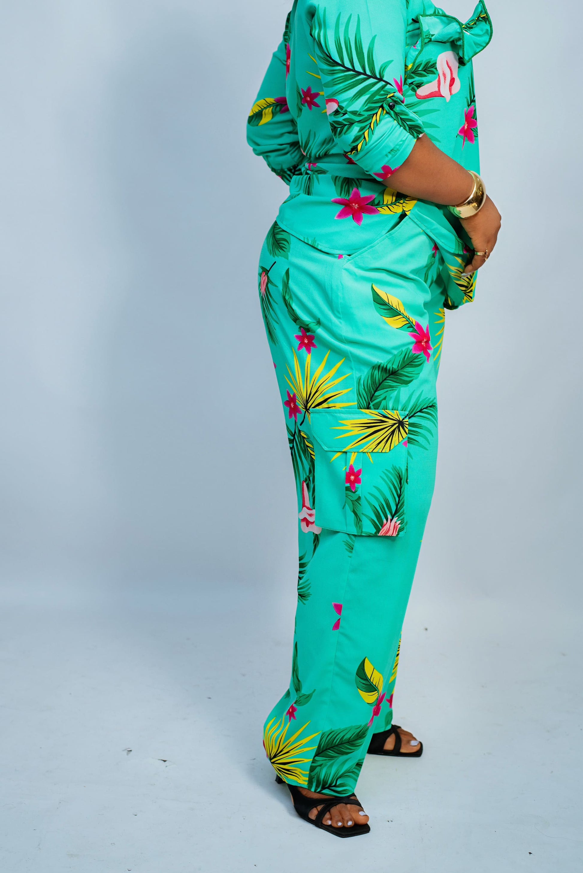 The TIANA set pairs a double-layer floral crepe top with Florence-style ruffles and turn-up 3/4 sleeves, with tailored cargo trousers featuring side and knee pockets and a clean zip fly.