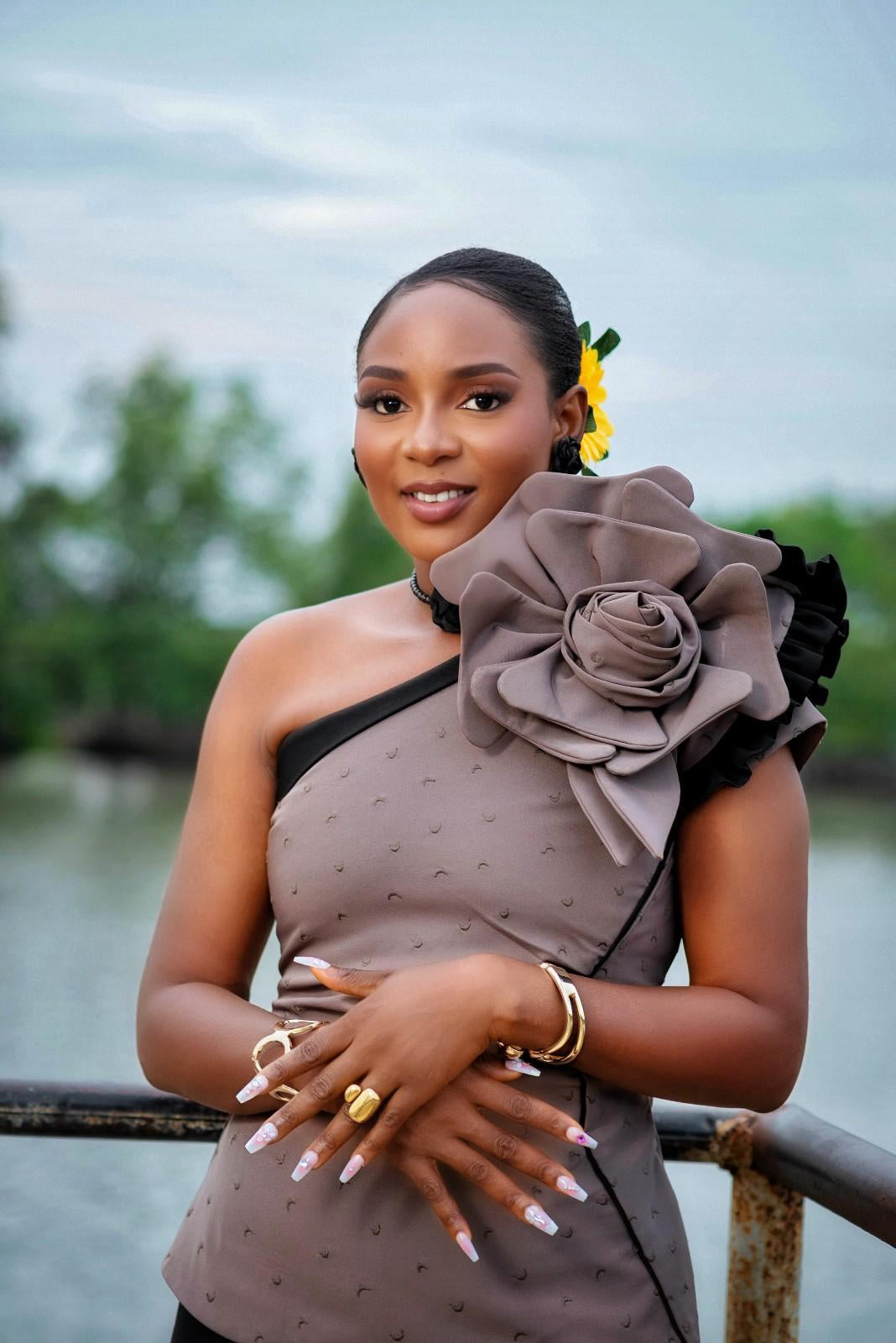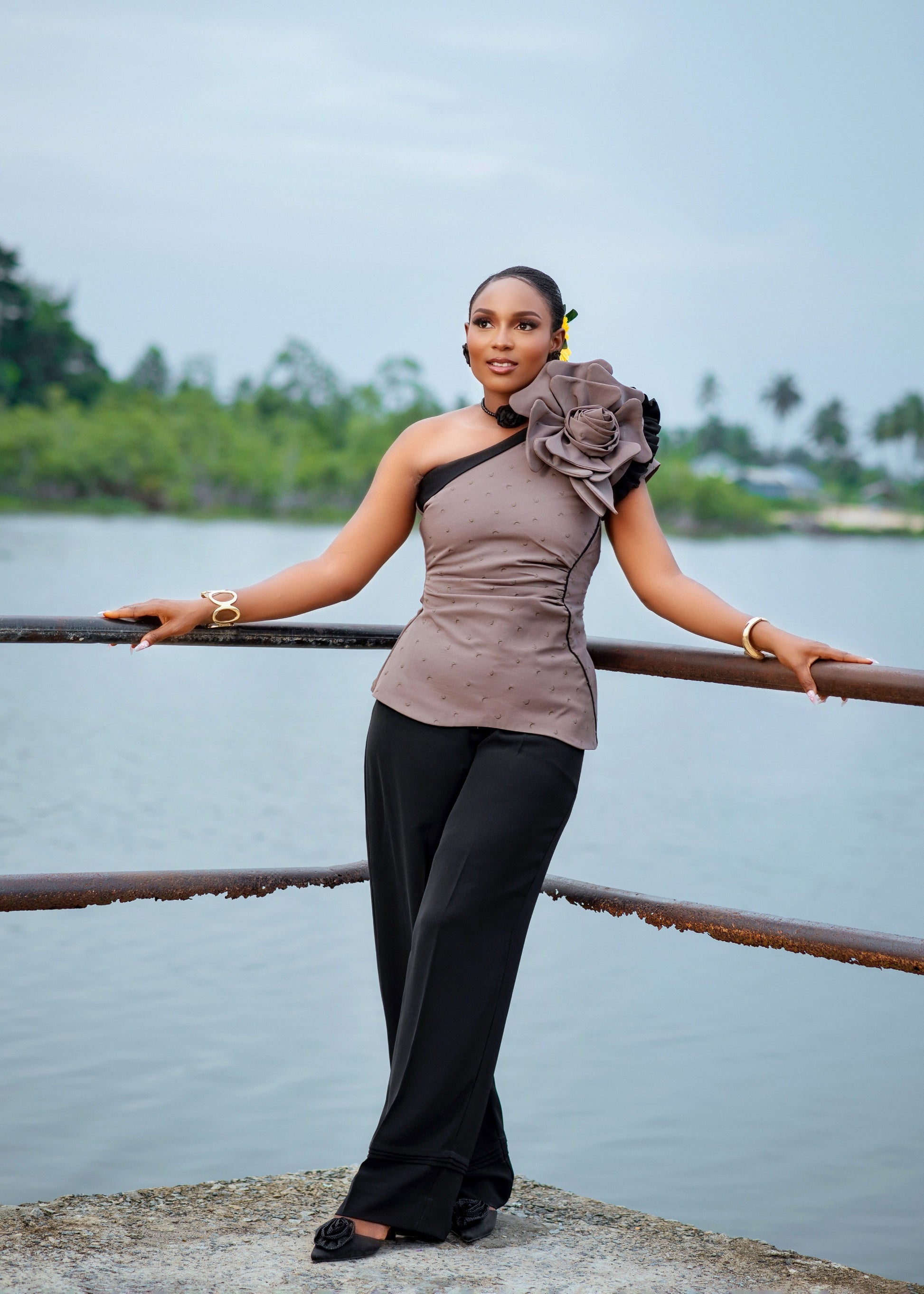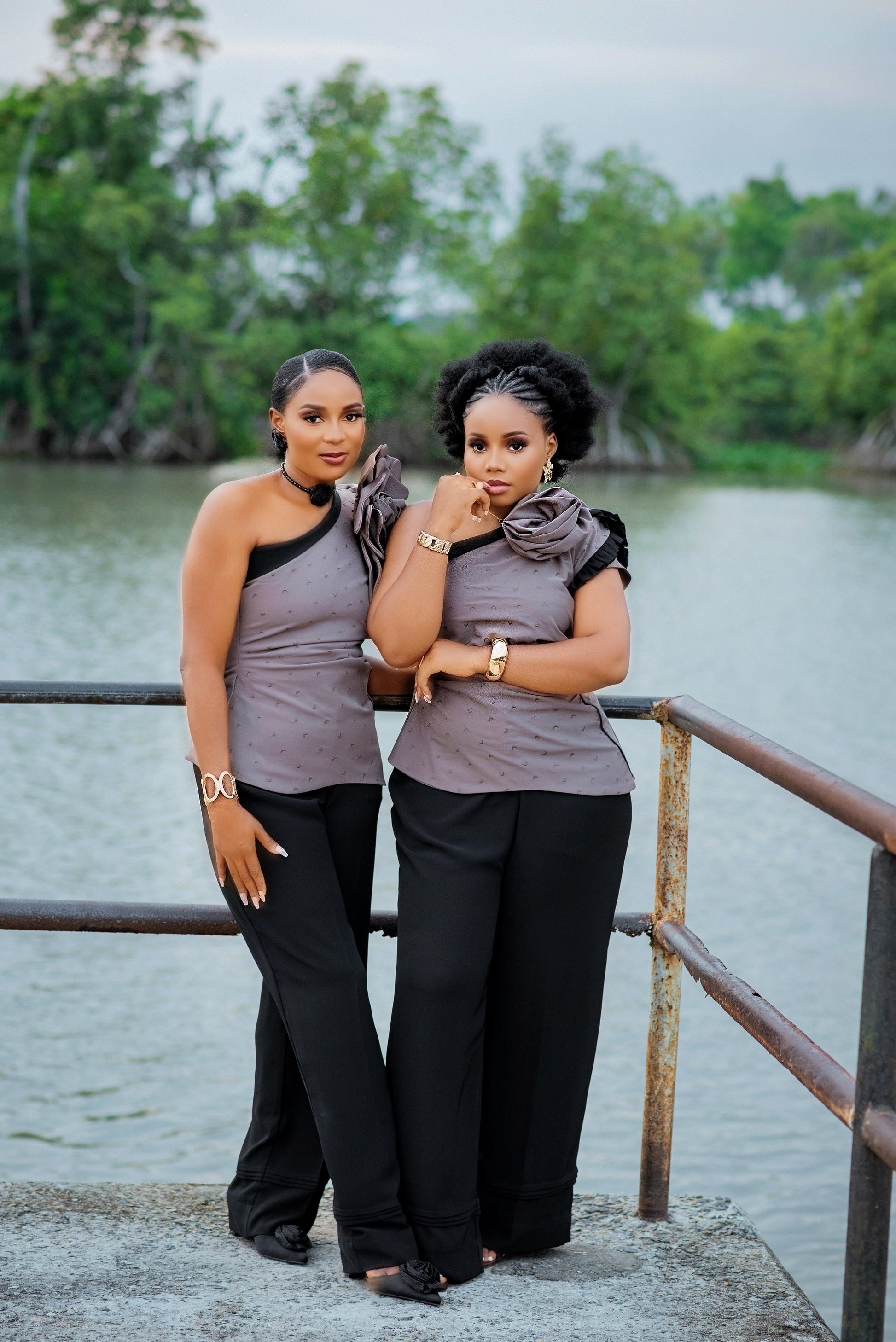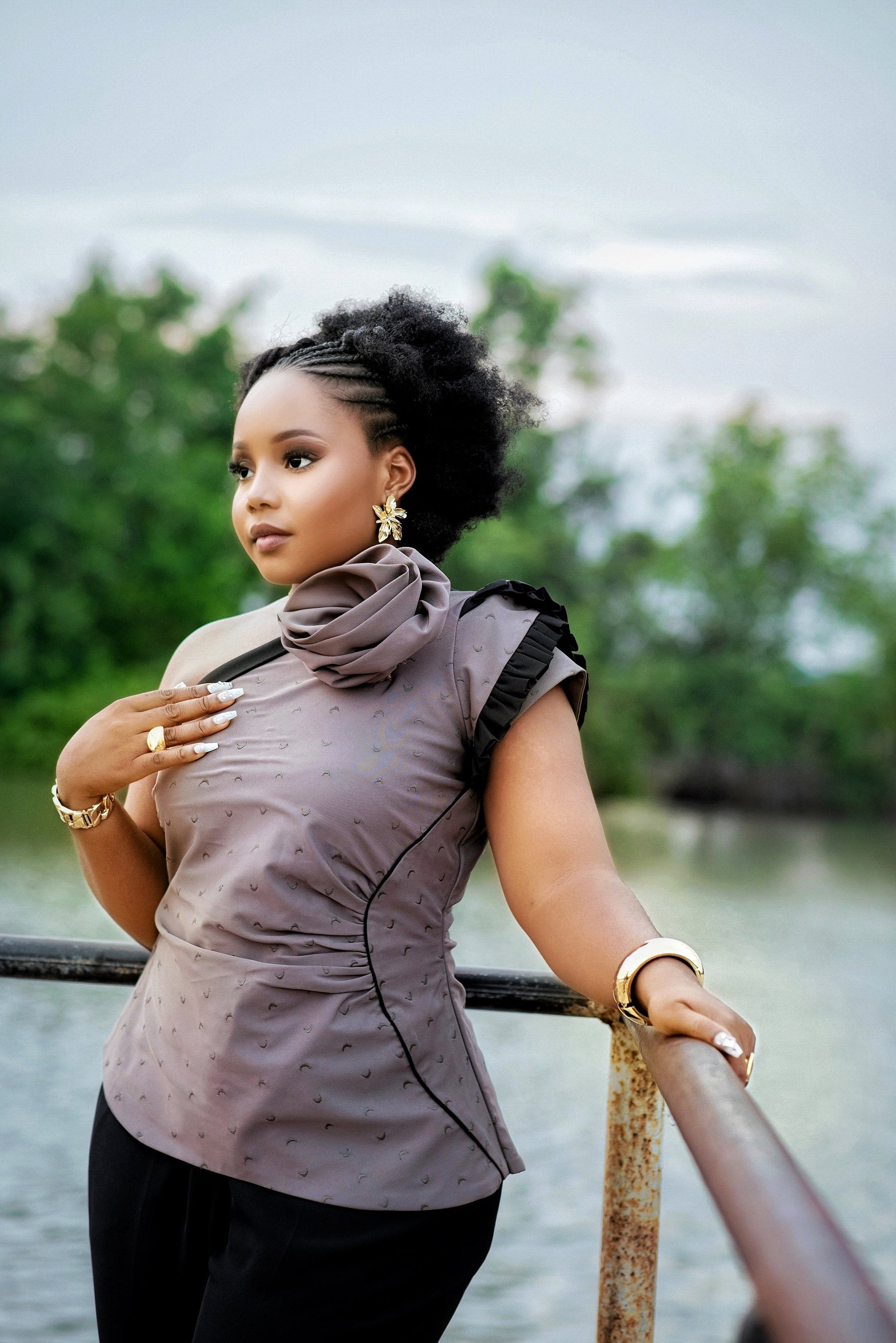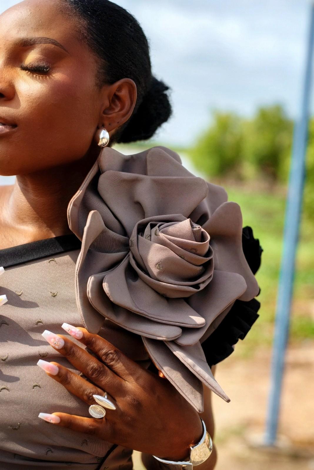 The Valencia top is statement piece crafted from high quality dim grey crepe, complimented by a black crepe fabric. It has a ruched design on one side of the waist line with a black piping for a defined look, the hem line of the one shoulder blouse has a wavy finish. The shoulder has a mini sized black shawl collar, and the fabric is HAND-EMBROIDERED with half-moon designs It comes in two detachable rose brooches for added flair. The sleeve has a puff tulip design layered over a cap sleeve, which was supported with a crinoline for more structure and it has a zip for easy wear.